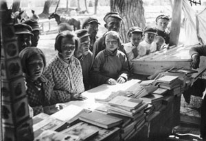 На фото из Антологии "Урянхай. Тыва дептер": Александр Адольфович Пальмбах ведет урок, книжный киоск, 1935 год.