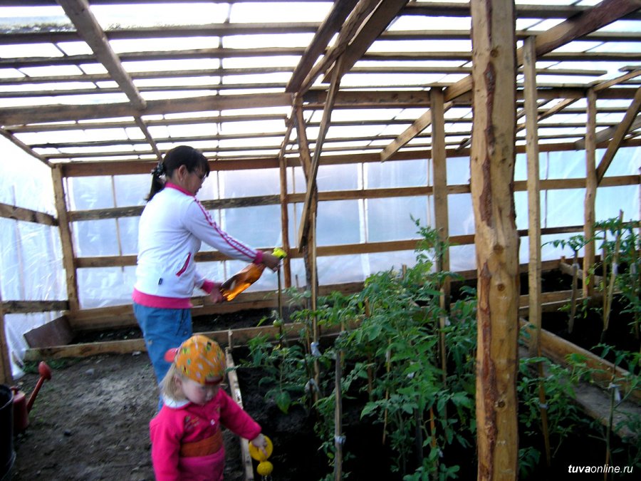 Родственники, объединив усилия, вывезли с площадки будущей теплицы несколько КАМАЗов камней, завезли чернозем, закупили в Кызыле рассаду. В консультанты привлекли выпускницу сельскохозяйственного техникума. Ежедневно на полив уходит тонна воды.
