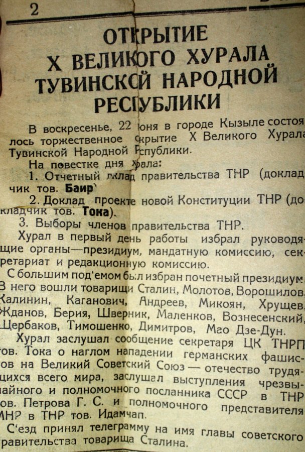 Благодаря совпадению, во многом символическому – на 22 июня был назначен очередной, Х-й Великий Хурал (съезд). В Кызыле собралось более 330 посланцев из всех районов Тувы. Хурал должен был принять очередную, пятую конституцию страны. Но этот вопрос ушел на второй план. Помощь братской стране – стала вопросом № 1. И республика решением съезда народа в принятой Декларации первой заявила: “Тувинский народ во главе со всей революционной партией и правительством, не щадя жизни готов всеми силами и средствами участвовать в борьбе советского союза против фашистского агрессора до окончательной победы над ним”. Этот документ, официально называвшийся “Декларация X Великого Хурала трудящихся ТНР о готовности тувинского народа всеми силами и средствами участвовать в борьбе с фашистской Германией”, со вступлением в 1944 году Тувы в состав СССР автоматически утратил свою силу. Но многие историки все еще шутят, что Тува до сих пор находится в состоянии войны с Германией.