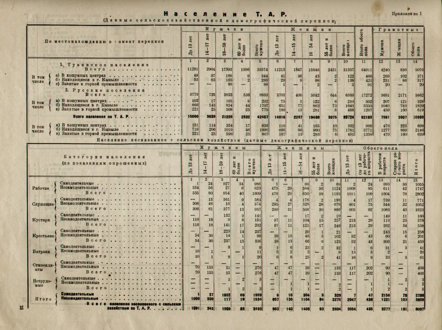 По данным переписи, составленной Павлом Петровичем Масловым, в 1930 году в ТНР проживало 82 183 человека, из которых мужчины составляли большую часть – 42 457. Коренных жителей было 64 911, они составляли 78,9% населения. Грамотой владели 10988 людей, это 13% населения.