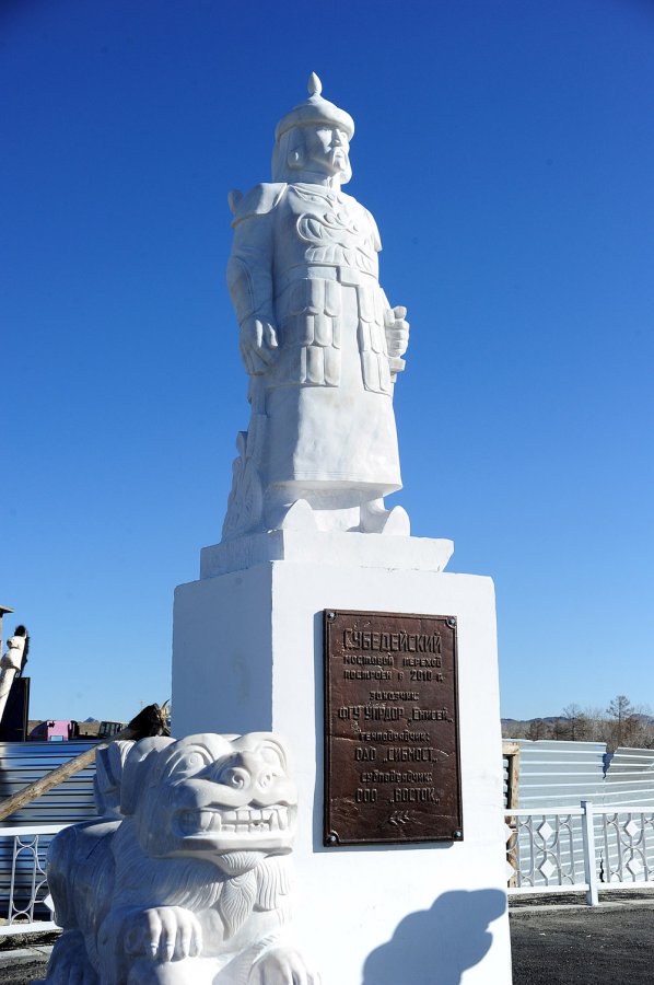 Еще новый мост интересен тем, что у него, единственного в республике, будет имя собственное: Субедейский, в честь знаменитого полководца. На площадке рядом со въездом на мост установили изваяние самого Субедея работы скульптора Сергея Ойдупа.