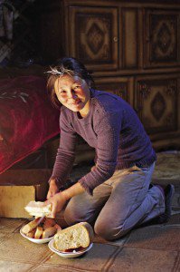 В Туве есть семьи чабанов, у которых в хозяйстве больше 1000 голов разного скота, их здесь называют «тысячники». Хозяйка первой точки, Арина, – «тысячница», у нее 1300 голов овец и коз и 64 сарлыка, из которых больше 20 дойных коров. Как она одна умудряется со всем этим управляться, я и сейчас не понял, но как-то может. Муж погиб несколько лет назад, осталась Арина одна со стареньким, уже слабым отцом. Вокруг зимней стоянки, маленькой бревенчатой избушки, широкие просторы склонов-пастбищ, рядом загоны для скота. Вставая до света, как и положено фотографу, я встречал Арину за работой – дойкой сарлыков. Собираясь спать далеко после захода солнышка, видел еще работающую Арину. Спрашивал, устает ли она, – она не знает, что такое усталость, это просто ее жизнь. Мягкая улыбка не сходит с лица. Показывает ягнят – радуется, угощает пельменями – сияет. Угощает чаем с молоком – пьешь, а пиала снова полная. Дома чисто и уютно, всегда есть арака для гостей.