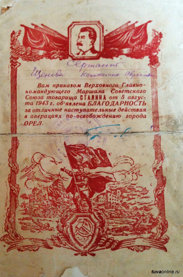 Накануне праздника в гостях у ветерана побывали учащиеся школы № 1, члены возрождаемого краеведческого кружка «Улуг-Хем». Выпускницу школы № 1 г. Кызыла Агапею Щенову на фронте переименовали в Капиталину, вот и благодарности главнокомандующего Иосифа Сталина за отличную службу получала уже Капиталина Щенова.