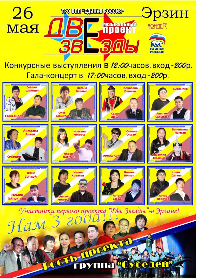 В воскресенье, 26 мая, в Эрзине под эгидой местного отделения партии «Единая Россия» проведен музыкальный шоу-конкурс «Две звезды-3».