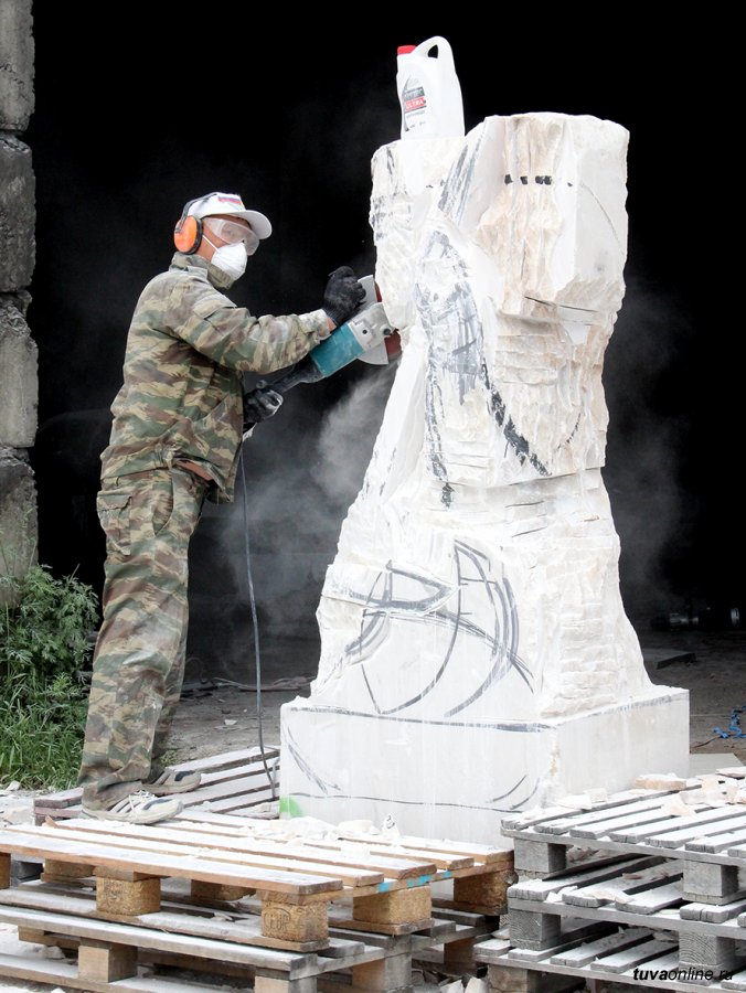 В эти дни на правом берегу Кызыла, на производственной базе «Водоканала» кипит работа. «У вас настоящая Сахара!» - признались гости Главе города Дине Оюн. До конечной обработки еще далеко – пока отсекается лишнее. Вокруг летят в разные стороны сколы, глаза скульпторов защищают специальные очки. Кто-то работает в специальной защитной робе, кто-то в шортах и майке (слишком жарко!).