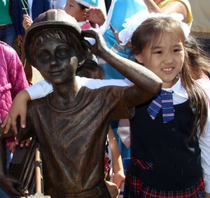 Юный шахтер появился на новом Арбате в центре города Кызыла. Малая композиция – подарок Тувинской горнорудной компании столице Тувы в честь ее векового юбилея и предстоящего праздника – Дня шахтера. Коллектив Каа-Хемского угольного разреза собрался сегодня на площадке перед кинотеатром «Найырал» и поздравил горожан праздничными концертными номерами. На представление собралось много детей и молодежи. Всем было любопытно увидеть юного шахтера. Как только сняли полотно с памятника, ребятишки тут же окружили его и стали фотографироваться.