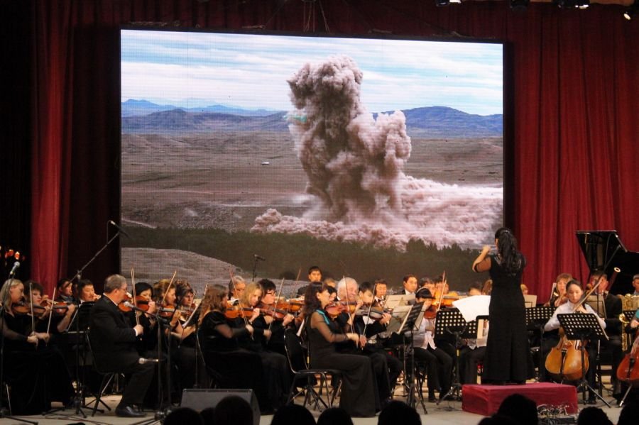 Полноценный симфонический оркестр – 48 исполнителей: сформирован из местных музыкантов, в том числе и совсем юных – учеников республиканской школы искусств, усилен струнной группой хакасского симфонического оркестра. Отрывки из произведений Петрова, Стравинского, Свиридова, Чыргал-оола, Скрябина, Тока, Шостаковича, Кенденбиля, Израилевича, русские и тувинские народные мелодии плавно перетекают друг в друга.
