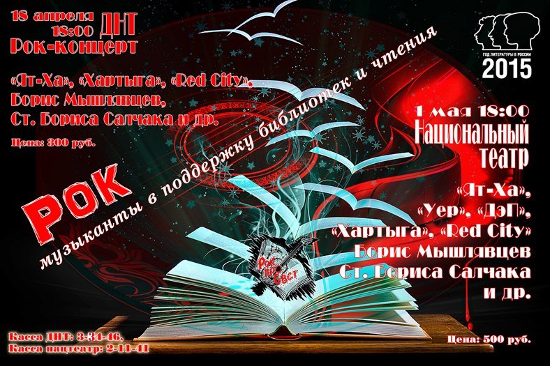 В рамках акции, приуроченной Году литературы в России, будут даны в Кызыле три концерта с участием рок-групп «Ят-Ха», «Уер», «Хартыга», «Redcity», «Дэп», «Ужур-ла бар», «Format A4», Студии Бориса Салчака и других. К акции примкнул и бард Сергей Сокольников с дочерью Лизой, увлекающейся роком. Все вечера пройдут в необычном формате. Помимо привычного репертуара рок-музыкантов, на концертах прозвучат рок-композиции, основанные на поэзии классиков и художественное чтение в исполнении музыкантов, библиотекарей и артистов Национального музыкально-драматического театра. В новом звучании будут представлены поэзия Сергея Есенина, Марины Цветаевой, Анны Ахматовой и других. Тема литературы будет продолжена и в фойе, где будет оформлена выставка картин художника Татьяны Махагаровой. Зрители оценят иллюстрации к сказкам Андерсена (с этими работами была выпущена книжка сказок на тувинском языке) и копии картин на библейские сюжеты французского художника-гравёра Гюстава Доре. Свои картины представит и музыкант, поэтесса, вокалистка Татьяна Крыцина. В числе ее работ пейзажи, написанные маслом и акварелью, абстракции-мандалы, выполненные акварелью и флуоресцентной гуашью, и портреты друзей и родных.