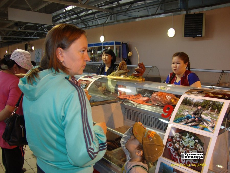 Прилавок тоджинки Шорааны был красочно оформлен. Его даже украшала фигурка, изображающая медведя-рыбака, который тащит огромную щуку. Рыба индивидуального предпринимателя Сайдаша Кола из с. Чазылар, которой торговала Шораана, шла нарасхват. Когда девушка накладывала ее в пакеты для покупателей, с нее даже слетала серебристая чешуя — значит, рыба наисвежайшая.