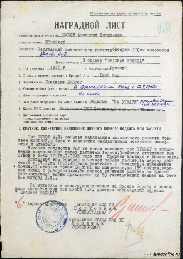 Валентина Александровна поблагодарила всех, кто пришел на встречу с потомками Шумовых. Поделилась воспоминаниями из своего детства. Отец, Александр Терентьевич, ушел на фронт в 1942 году. Приезжал на побывку в апреле 1944-го. Ездил по районам, рассказывал, как они воюют. От Салчака Токи тогда семье привезли целый воз гостинцев. Особенно Валентине, которой тогда было десять лет, запомнился мешок глазированных пряников. От них шел такой аромат, что кружилась голова. С фронта отец вернулся в апреле 1945-го. Израненный, худой. И в это время в Кызыле случилось большое наводнение. Дамбу прорвало, и поток воды устремился по улице Кочетова.