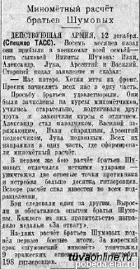 В конференц-зале была оформлена небольшая выставка с родословной и фотографиями. На одной из них — Терентий Дементьевич (1869–1969) и Агафья Степановна (1873 — 1962) Шумовы, родители Александра Терентьевича. От них пошло наше потомство, сказала Валентина Александровна, которая и взяла на себя непростую задачу: составить родословную семьи Шумовых, которая берет начало от Карпа (1800-1883) и Пелагеи (1809-1884) Шумовых. Потомков от их сыновей Фадея и Дементия насчитывается 382 человека. В роду Шумовых подрастает уже девятое поколение. Крестьянские семьи Шумовых были многодетными, имели и до десяти детей. Некоторые из их потомков находились в зале. Не все родственники знают друг друга, поскольку живут в разных местах. Именно поэтому они горячо благодарили Валентину Александровну, взявшую на себя такой труд: собрать всех, имеющих отношение к роду Шумовых. Одна из них — Наталья Галкина. Многие кызылчане, имеющие братьев меньших, знают эту женщину — она ветеринарный врач. Теперь мы знаем, что она — еще и внучка Авксентия Никитича, одного из братьев-минометчиков.