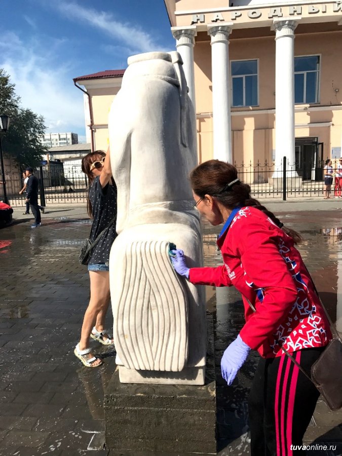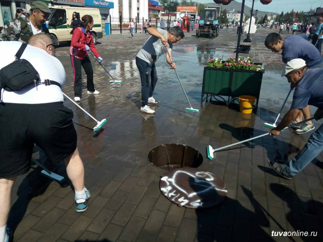щетки, девчата тряпками отмыли скамейки, фонари, стелу «Я люблю Кызыл», работу «Малчын»