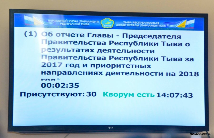 Глава Тувы Шолбан Кара-оол представил отчет о деятельности правительства республики в 2017 году Верховному Хуралу. Выступление состоялось 19 апреля в рамках очередной, VIII сессии парламента:
