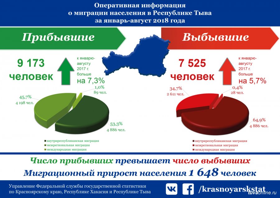 Росстат приводит данные по миграционной убыли и прибыли по трем регионам Сибири – Красноярскому краю, Хакасии и Туве. Самая большая миграционная прибыль по итогам 8 месяцев фиксируется в Республике Тыва – 1648 человек. В Туву за первые 8 месяцев приехало 9173 человека, выехало 7525 человек. Миграционная прибыль в 391 человек зарегистрирована в Хакасии, сообщили ИА Тува-Онлайн в Красноярскстате.
