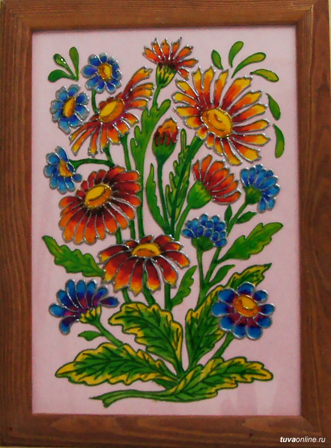 Каждый художник – человек ищущий, неуспокоенный. Желание попробовать новые техники, новые материалы есть у каждого. Так случилось и с Лейдой Эрнстовной. «Моя бабушка и мама очень любили цветы, вышивали их, делали из гофрированной бумаги. Я тоже цветы люблю. Бывало едешь по Саянам, а вокруг море жарков! Такая красота. А еще есть в горах такие маленькие неприметные фиолетовые цветочки, а заглянешь внутрь – какая гармония. А подсолнухи… поворачивают голову за солнцем. Такая радость наблюдать! Несколько лет назад я вдруг захотела рисовать цветы на стекле. Как раз в продаже появились специальные витражные краски. Сначала делала для себя, для души. А потом мне предложили поучаствовать с моими работами в выставках. И поскольку витражной живописью я стала заниматься одной из первых в Туве, мои букеты вызвали большой интерес у зрителей. Сейчас мы и с детьми стали заниматься этим видом изобразительного творчества».