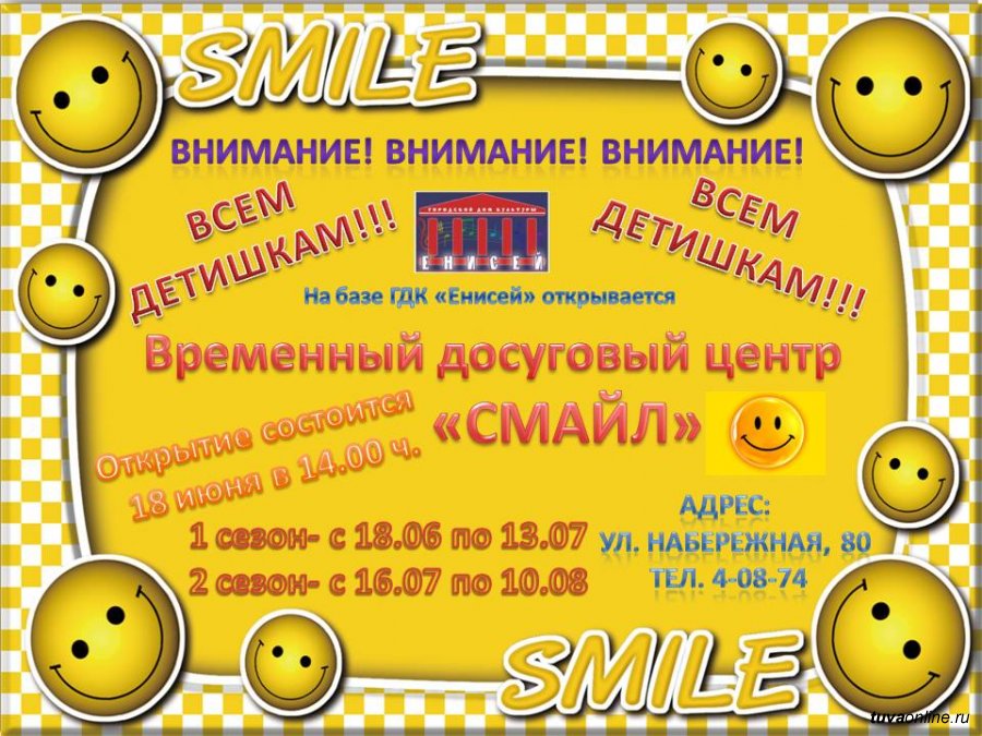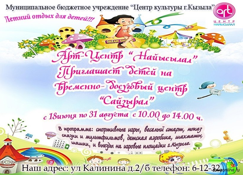 В Кызыле с 18 июня по 31 августа - период летних школьных каникул - на базе Арт-Центра "Найысылал" функционирует временный досуговый центр "Сайзырал", а также на базе ГДК "Енисей" - временный досуговый центр "Смайл".