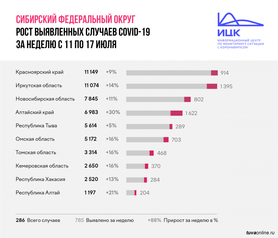 Информационный центр по мониторингу ситуации с коронавирусом проанализировал рост заболеваемости COVID-19 в сибирских регионах за неделю с 11 по 17 июля.