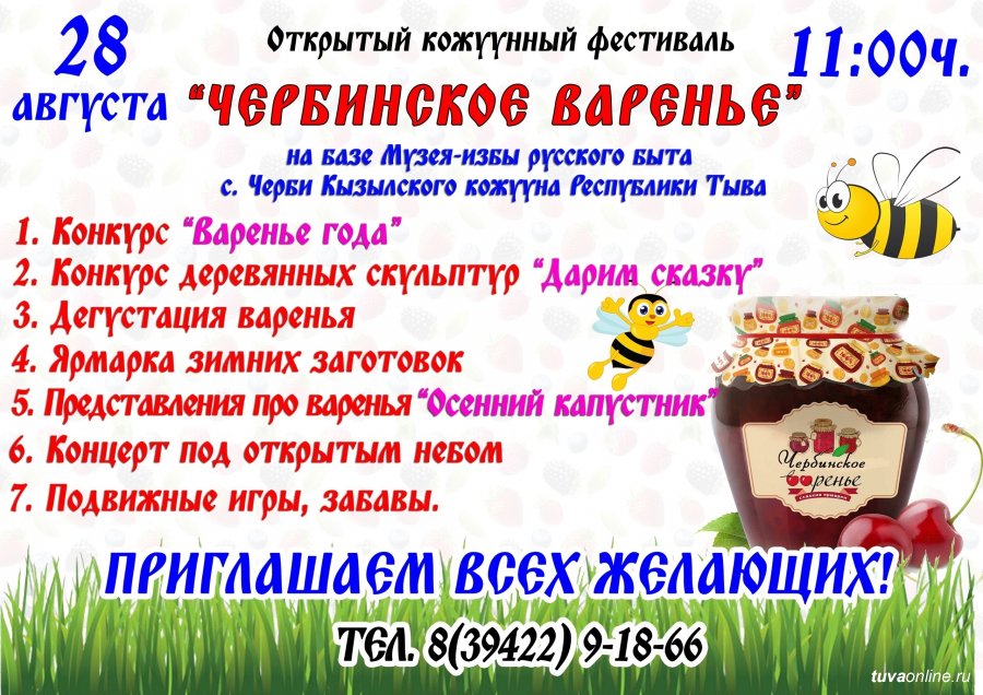 Жители Кызылского района Тувы приглашают всех желающих посетить открытый фестиваль, где выберут варенье года, приготовленное местными хозяюшками. Фестиваль состоится 28 августа на базе Музея-избы русского быта села Черби.