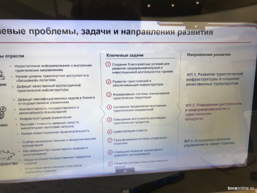 Глава Ростуризма обратила внимание, что среди трех основных направлений работы — развитие туристической инфраструктуры и создание качественных турпродуктов, повышение доступности и информированности о туристических продуктах, совершенствование управления в сфере туризма. «По каждому из этих больших блоков работы мы предлагаем сформировать федеральный проект с набором инструментария в виде мер поддержки», — сказала она.