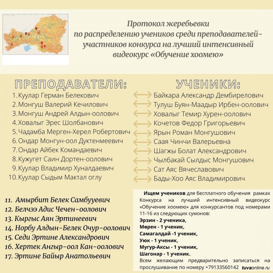 В Международной Академии «Хоомей» начались первые съемки авторских видеокурсов «Обучение хоомею». Всего зарегистрированы 17 участников-педагогов и 10 учащихся. По итогам жеребьевки ученики и преподаватели из города Кызыла приступили к занятиям.