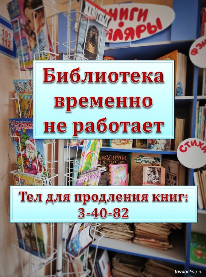 Выданные книги можно продлить по телефонам: 3-40-82 (главное здание), 5-23-55 (филиал на Московской). А запланированные мероприятия переносятся на более поздние сроки. О возобновлении мероприятий будет сообщено после выхода особого распоряжения, сообщили Тува-Онлайн сотрудники библиотеки.