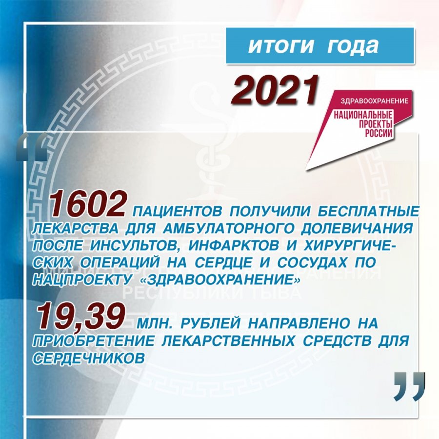Более 1,6 тыс. пациентов в Туве, перенесших в 2021 году острое нарушение мозгового кровообращения, инфаркт миокарда, а также хирургические операции на сердце и сосудах, получили бесплатные лекарства для поддержания здоровья и профилактики благодаря нацпроекту «Здравоохранение», сообщили в министерстве здравоохранения республики. Если в 2020 году пациенты-сердечники могли получать лекарственную поддержку только в течение одного года, то с 2021 года — в течение двух лет. Нововведение коснется тех, кто поставлен на диспансерный учет с 1 января 2021 года.