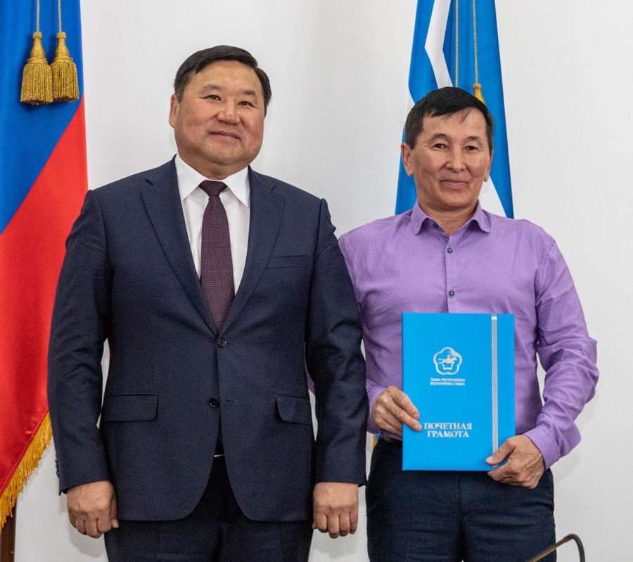 Звания «Заслуженный работник Республики Тыва» удостоены Соян Вячеслав Докаевич – генеральный директор ООО «Бай-Хаак Аква» и Оюн Станислав Чертак-оолович – преподаватель Профессионального училища №1.