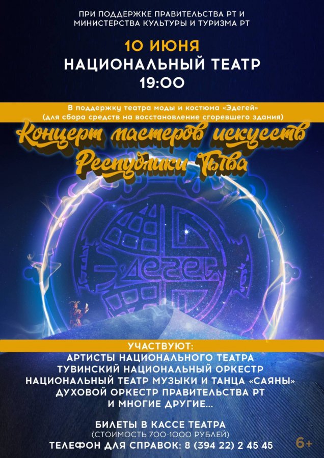 Сегодня в 19 часов Национальном театре Тувы состоится большой концерт мастеров искусств Республики Тыва. Артисты Национального музыкально-драматического театра им. В. Кок-оола, Тувинского национального оркестра, Национального театра музыки и танца "Саяны", Духового оркестра Правительства Тувы и многие другие выступят в качестве поддержки Театра моды и костюма "Эдегей" - собранные на концерте средства пойдут на восстановление пострадавшего от пожара здания "Эдегея" и уникальных коллекций.
