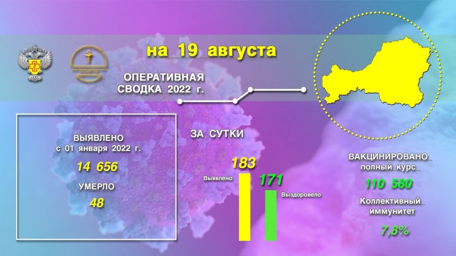 Эпидситуация по коронавирусу в Республике Тыва по данным Управления Роспотребнадзора по РТ и Минздрава РТ за 18 августа на 19.08.2022 г. За последние сутки выздоровели 171 человек. За сутки выявлено 183 новых случаев заболевания COVID 19, лабораторно подтвержденных, что на 85 случаев меньше, чем за предыдущий день, в 13 муниципальных образованиях. Из 183 заболевших дети составляют 57 человек (31,1%), взрослые - 126 человек (68,9%).