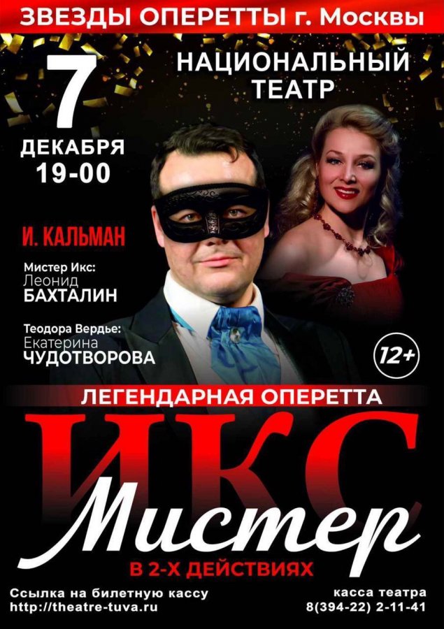 7 декабря в Национальном театре им. Виктора Көк-оола — звёзды оперетты г. Москва выступят с легендарной опереттой Имре Кальмана «Мистер Икс»! Таинственный, интригующий Мистер Икс – персонаж легендарной оперетты «Принцесса цирка» венгерского композитора Имре Кальмана на протяжении почти целого века будоражит сердца и заставляет трепетать души.