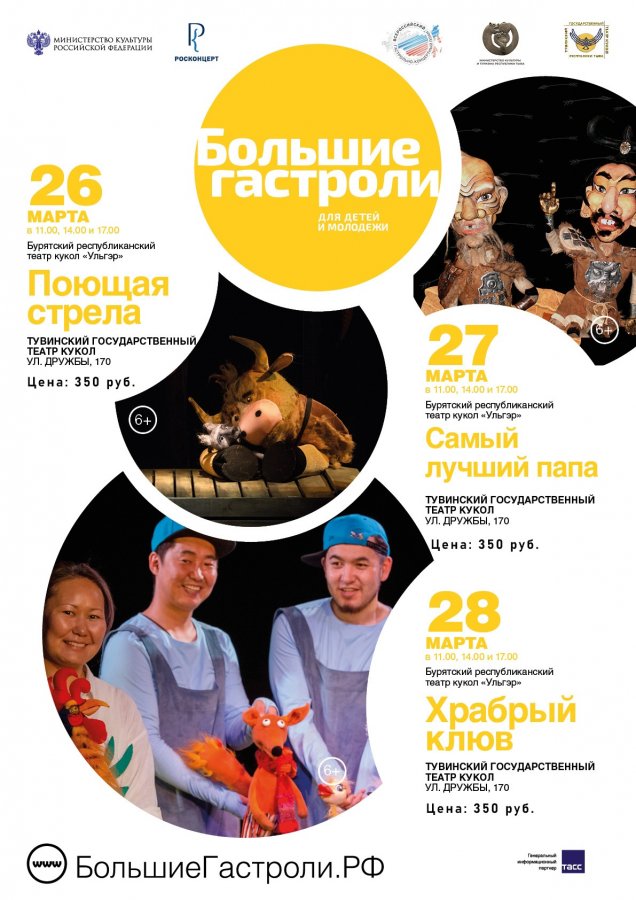 В рамках направления по поддержке детских и молодежных театров «Больших гастролей» на сцене Тувинского государственного театра кукол пройдут показы спектаклей «Поющая стрела», 6+ - лауреат национальной театральной премии «Золотая маска» 2006 года в двух номинациях: «Лучший спектакль в театре кукол» и «Лучшая мужская роль в театре кукол», спектакль «Самый лучший папа», 0+, «Храбрый клюв», 0+