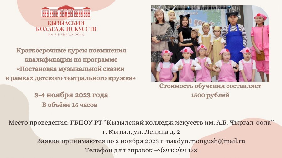 В Кызылском колледже искусств им. А. Б. Чыргал-оола 3-4 ноября по программе дополнительного профессионального образования пройдут краткосрочные курсы повышения квалификации по программе «Постановка музыкальной сказки в рамках детского театрального кружка» в объёме 16 часов.