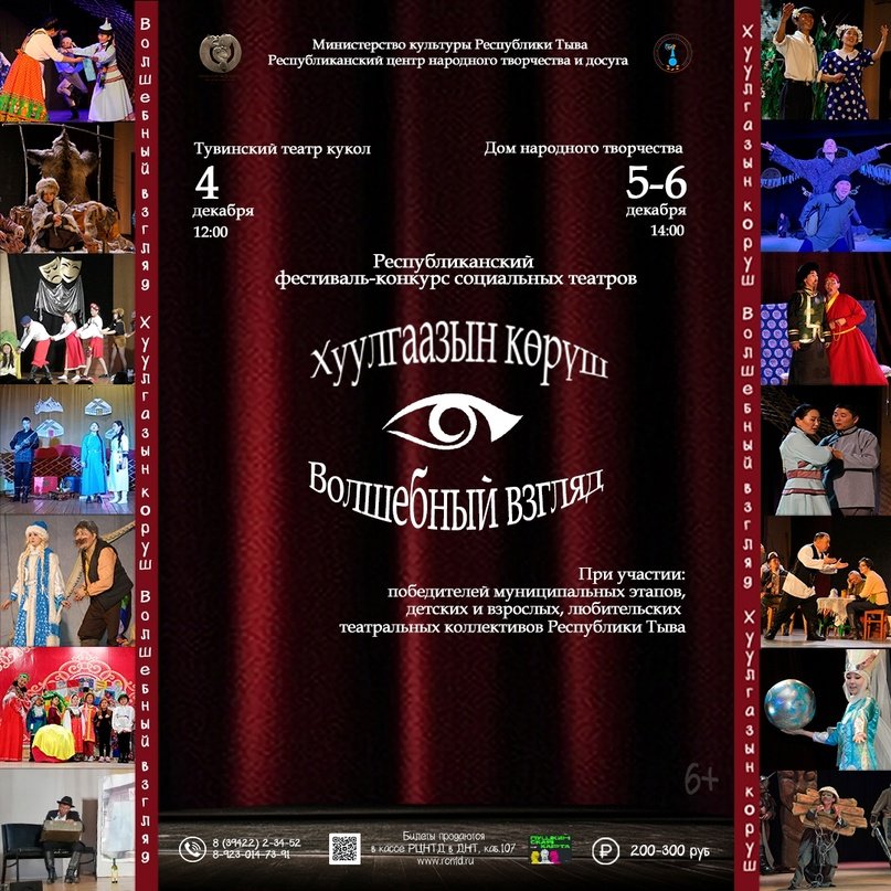 17 театральных коллективов Тувы примут участие в фестивале-конкурсе социальных театров "Хуулгаазын көрүш" (Волшебный взгляд). 4 декабря с 12 часов на площадке Тувинского государственного театра кукол свои конкурсные спектакли представят 8 детских коллективов из Дзун-Хемчикского, Чаа-Хольского, Сут-Хольского, Овюрского, Каа-Хемского, Чеди-Хольского и Монгун-Тайгинского кожуунов. Участники представят кукольные спектакли, сказки, музыкальные постановки и драму.