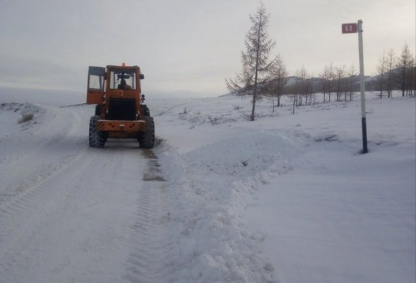 На фото участок а/д Хандагайты - Мугур-Аксы км 0+000 км 84+000 очистка дороги от снега плужным оборудованием на базе комбинированной дорожной машины.