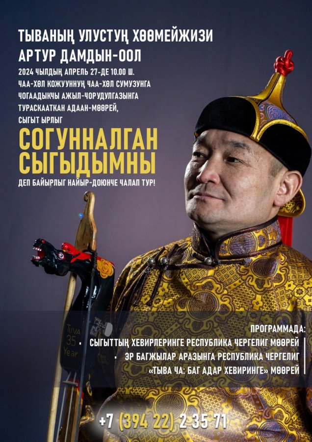 27 апреля в честь присуждения солисту фольклорного ансамбля "Тыва" Артуру Дамдын-оолу звания «Народный хөөмейжи Республики Тыва» состоится республиканский спортивно-художественный праздник «Согунналган сыгыдымны», который включает в себя проведение следующих мероприятий: