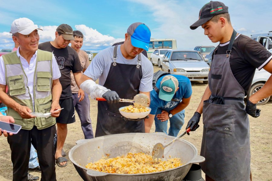 Гости праздничных мероприятий в местечке «Тос-Булак» смогли отведать настоящий узбекский плов. Его представители узбекской диаспоры города Кызыла готовили прямо на месте: