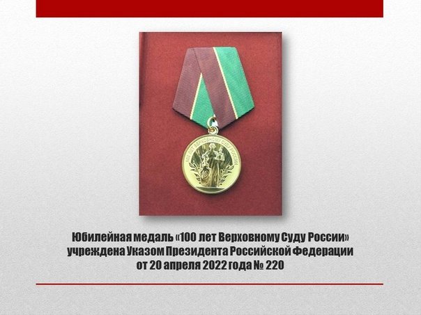 Юбилейная медаль «100 лет Верховному Суду России» учреждена Указом Президента Российской Федерации от 20 апреля 2022 года № 220, удостоверения о вручении награды подписаны председателем Верховного Суда Российской Федерации И.Л. Подносовой.