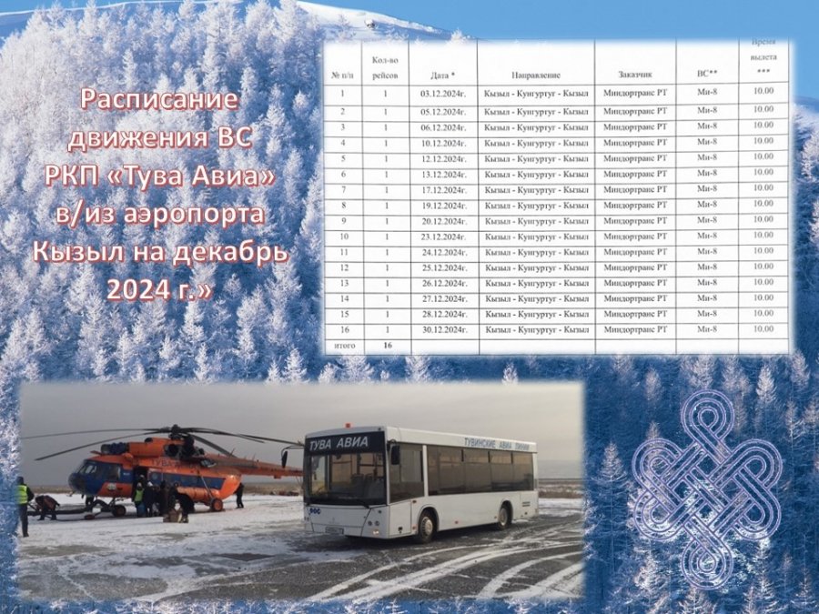 16 авиарейсов до поселка Кунгуртуг Тере-Хольского кожууна выполнит авиакомпания «Тува Авиа» в декабре текущего года, сообщает Тува-Онлайн по информации Миндортранса Тувы.