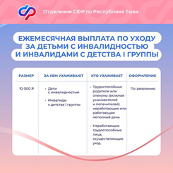 Отделение Социального фонда России по Республике Тыва информирует, что с этого года расширен круг получателей ежемесячной выплаты по уходу за детьми с инвалидностью и инвалидами с детства I группы в размере 10000 рублей. Ранее ее в таком размере получали только родители и опекуны, а также попечители и усыновители. Выплата остальным ухаживающим составляла 1680 рублей.