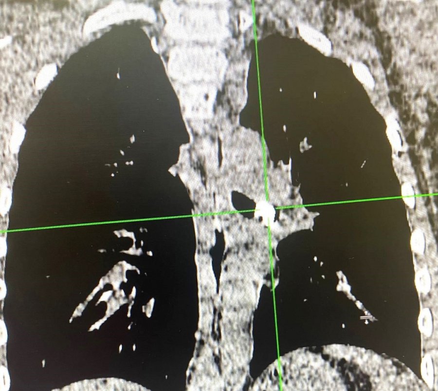 В Республиканскую больницу №1 поступил мальчик 9 лет с инородным телом, попавшим в бронхи. Оказалось, что во время еды у ребенка выпал шатающийся молочный зуб и попал в дыхательные пути. У ребенка появился кашель. После осмотра в лечебном учреждении по месту жительства пациент был доставлен в Республиканскую больницу №1. Исследование на компьютерном томографе показало наличие инородного тела в левом главном бронхе.