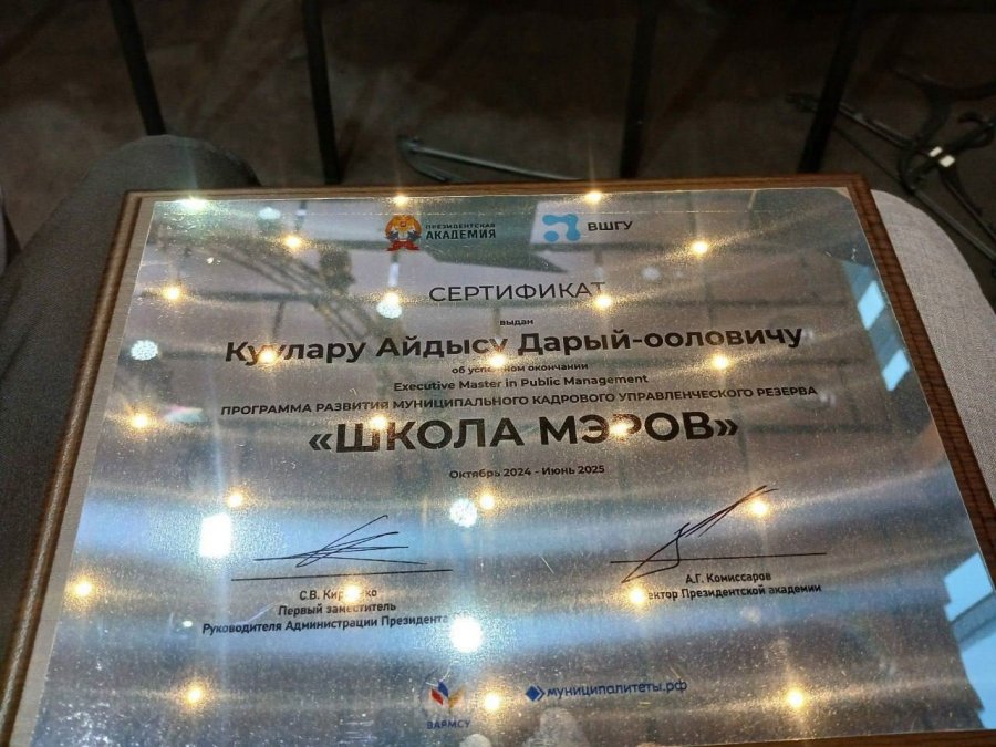 Айдыс Куулар, председатель администрации Дзун-Хемчикского кожууна, получил диплом об окончании «Школы мэров». Он представил Туву в шестом заключительном очном модуле программы развития муниципального кадрового управленческого резерва. Обучение проходили 160 слушателей из 82 регионов.